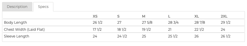- Improved Fit: plus 1" across waist, plus 1/2" sleeve length