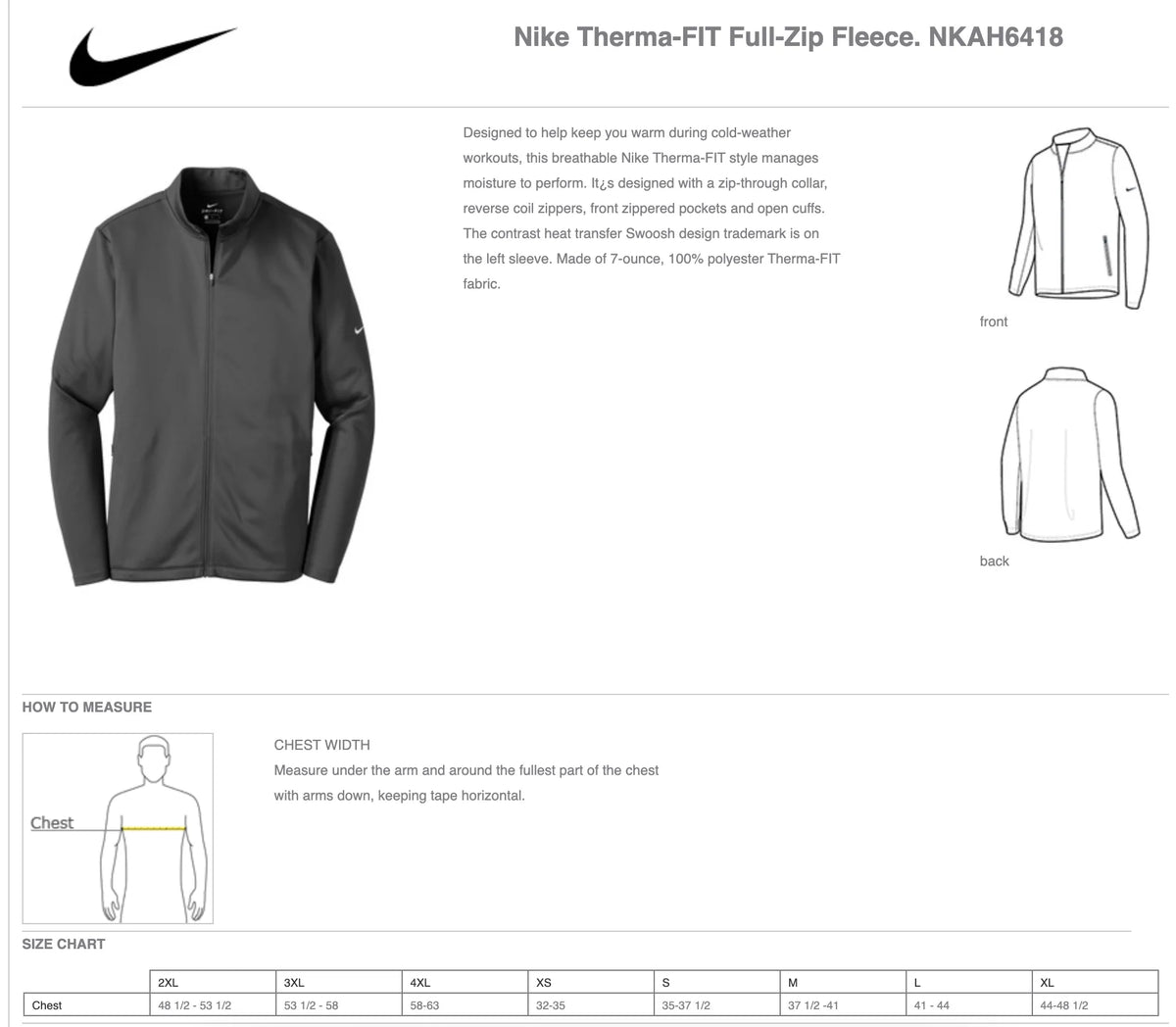Designed to help keep you warm during cold-weather workouts, this breathable Nike Therma-FIT style manages moisture to perform. It’s designed with a zip-through collar, reverse coil zippers, front zippered pockets and open cuffs. The contrast heat transfer Swoosh design trademark is on the left sleeve. Made of 7-ounce, 100% polyester Therma-FIT fabric.